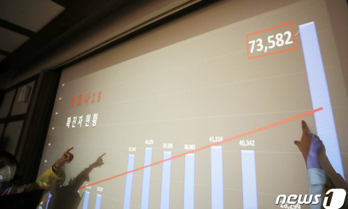 질병관리청 중앙방역대책본부에 따르면 19일 0시 기준 코로나19 신규 확진자는 7만3582명 발생했다. 16일째 '주간 더블링(확진자가 두 배씩 늘어나는 추세)' 현상이 이어지고 있다. 3주째 '2배→4배→8배'로 급증하는 추세다. 이번주에는 8만명을 돌파할 가능성이 크다. 다음주에도 속도가 둔화하지 않으면 10만명을 넘어 15만~16만명까지 증가할 가능성도 배제할 수 없다.